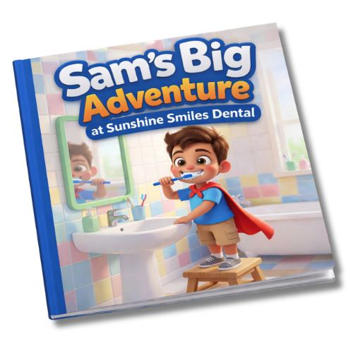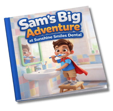 Sam's Big Adventure is our sample story — but every book we create is fully customized with your practice name, your branding, and your story. This is what your patients take home.